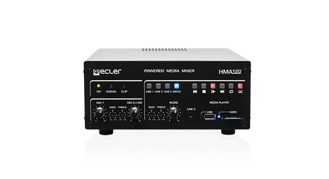 Self-powered mixer including an integrated media player (USB,SD) and 5 external audio inputs: 3 x LINE